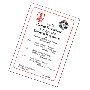 We are one again indebted to former Chairman Tommy Johnson for sharing images of the day along with Press cuttings. They can be viewed in the Cuala Gallery. What a wonderful sight to see so many Cuala families and supporters – some sadly no longer with us. And the Official Programme gives all the details as well as painting a fine picture of the remarkable progress being made in Cuala in the period.